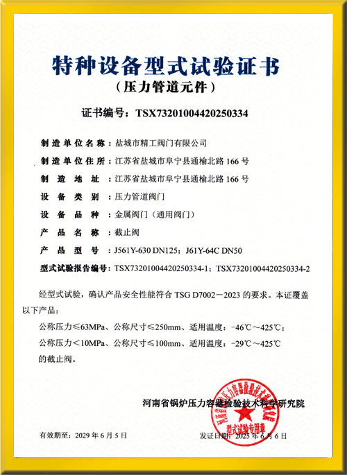 截止閥試驗(yàn)證書